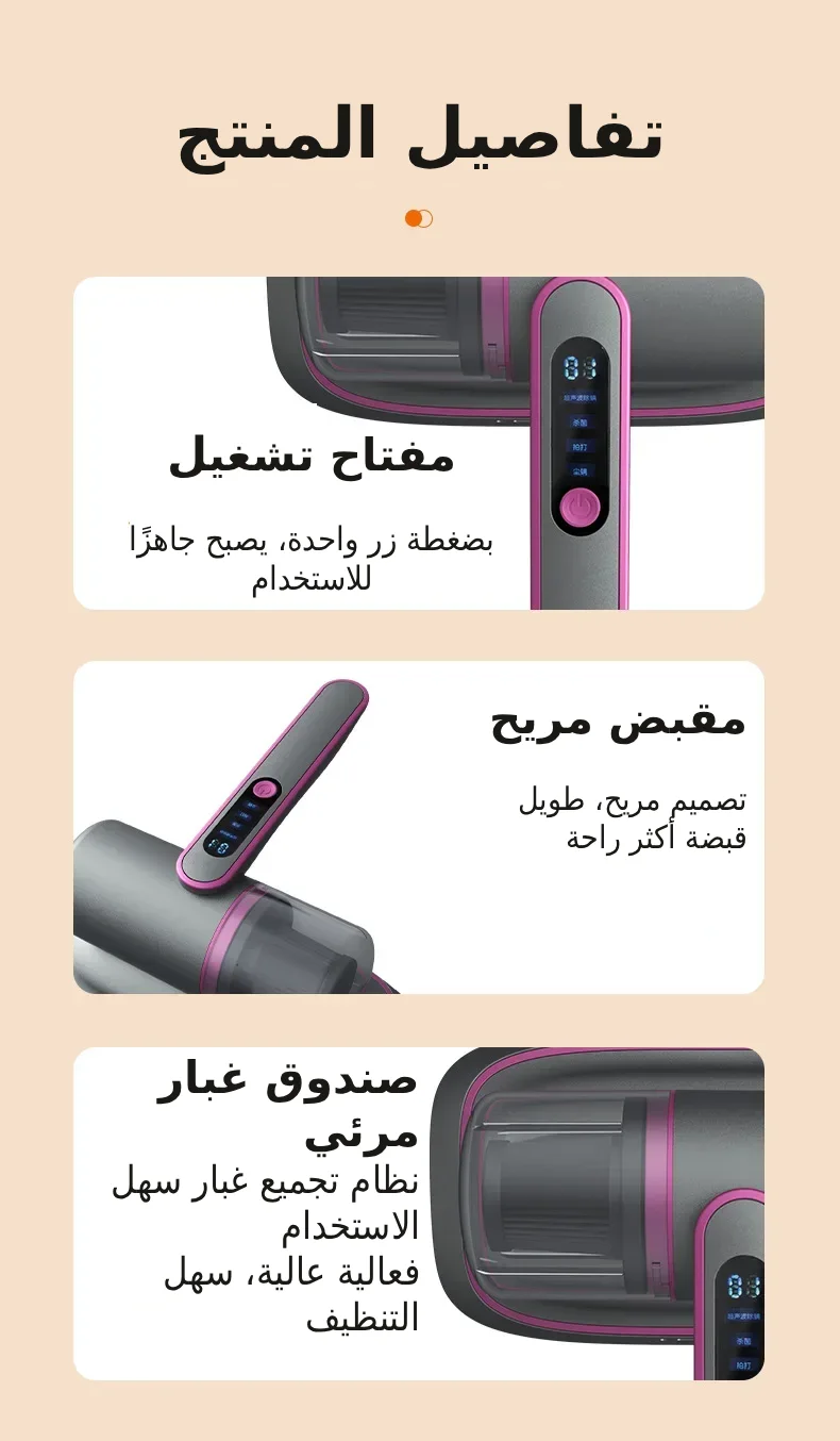 مستويان للطاقة: يُمكنك التبديل بين المستويين حسب الحاجة لتنظيف مُركّز. المستوى الأدنى مُناسب للتنظيف اليومي وإزالة العثّ، بينما المستوى الأقصى مثالي للتنظيف العميق. اضغط مرة واحدة لتشغيل المكنسة على المستوى الأدنى، ومرتين لتشغيلها على المستوى الأقصى، وثلاث مرات لإيقافها.