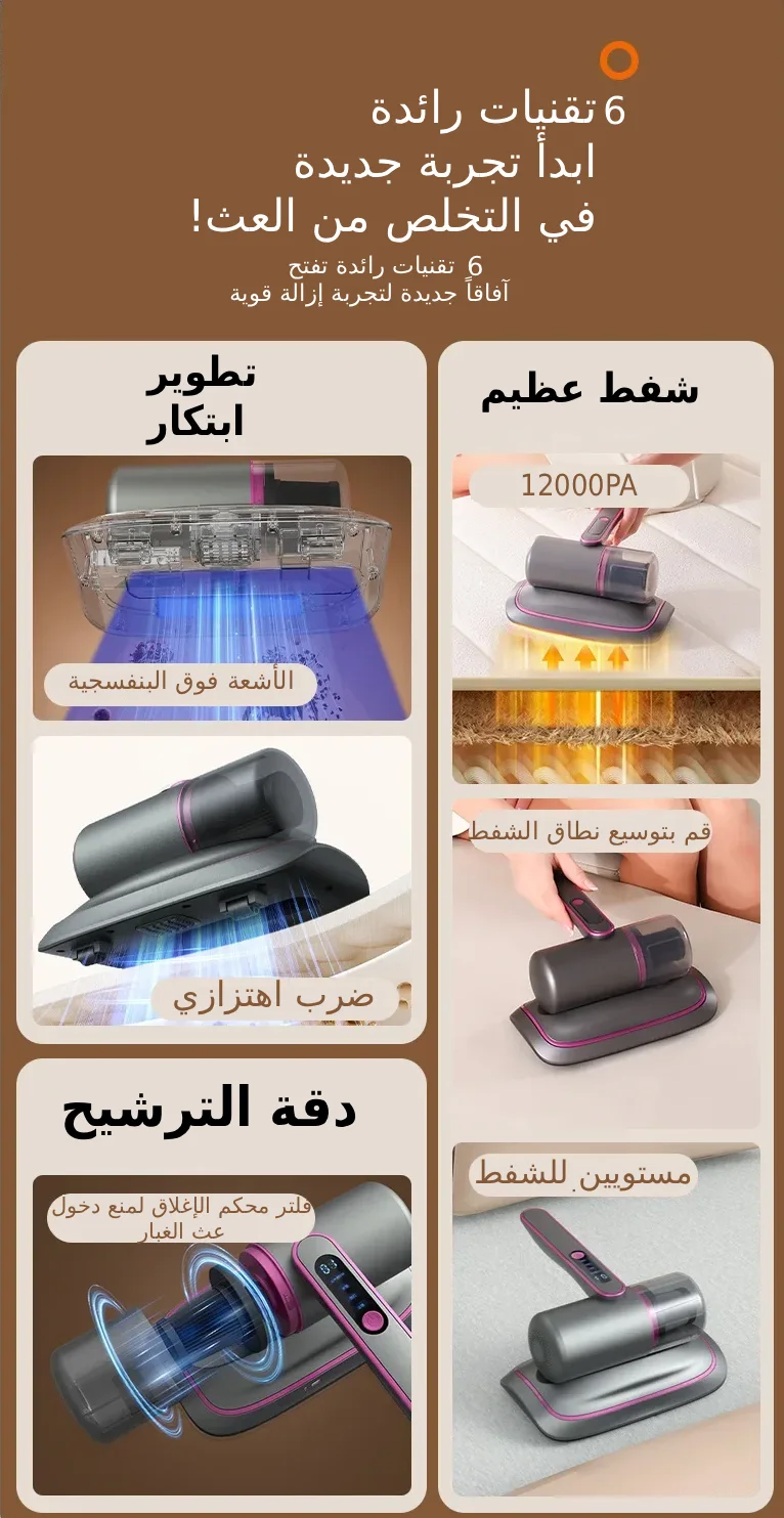 اهتزاز عالي التردد وقوي: تعمل السرعة العالية التي تصل إلى 8000 اهتزازة في الدقيقة على هزّ وإزالة العث والغبار وقشور الجلد بسرعة من الأسطح ومن أعماق المراتب والأرائك وغيرها.