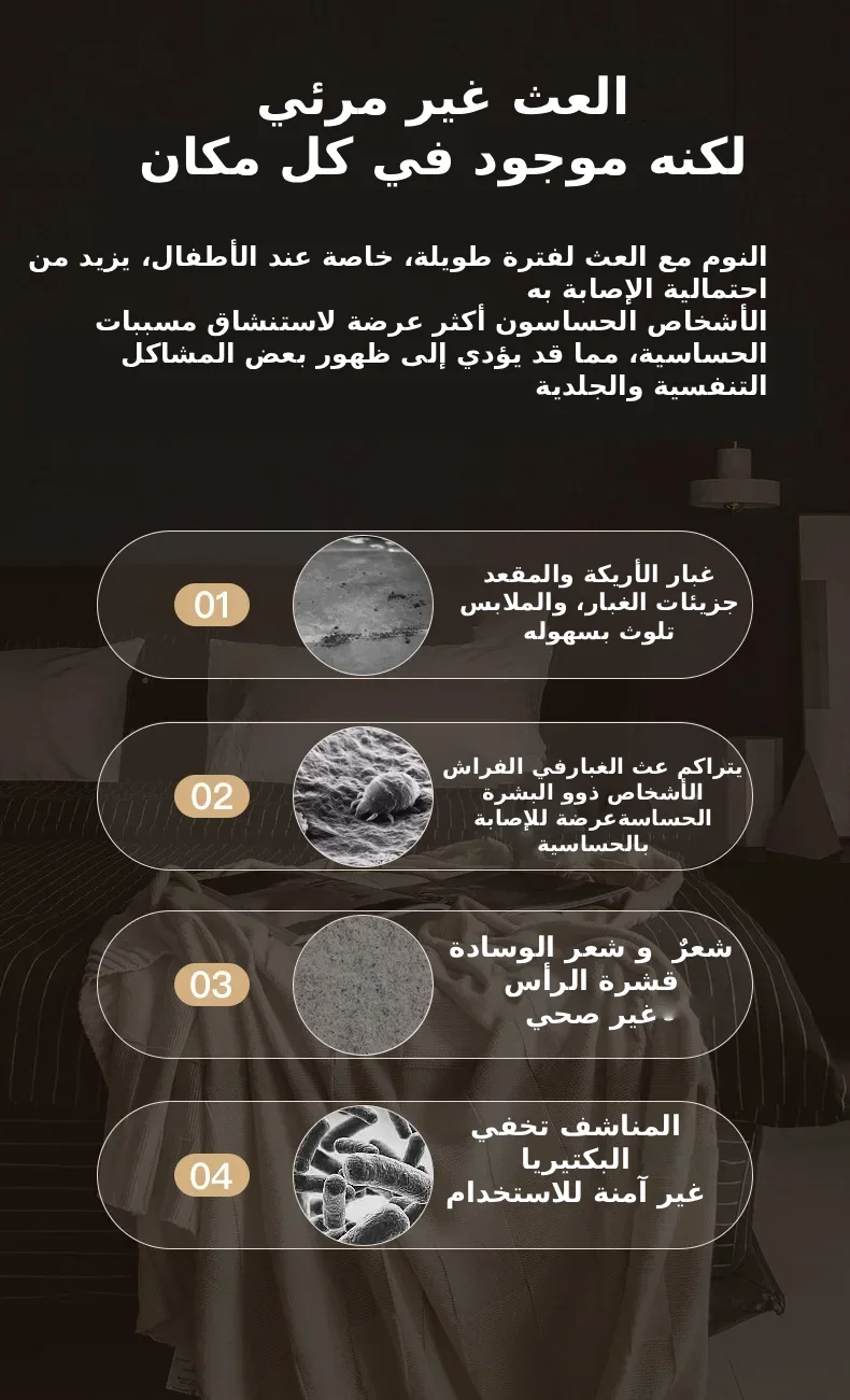 ضوء الأشعة فوق البنفسجية من نوع C: بفضل تقنية التعقيم بالأشعة فوق البنفسجية المبتكرة، تقضي الأشعة فوق البنفسجية عالية النفاذية على 95% من العث والبكتيريا بفعالية.